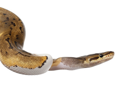 女性ピンストライプ ピエ高貴パイソン ボールパイソン ボールニシキヘビ 14 ヶ月 白い背景の前でのクローズ アップ の写真素材 画像素材 Image